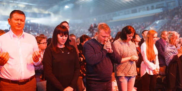 Прихожане Возрождения молятся, поднимая ладона вверх. Фото: vo.org.ua