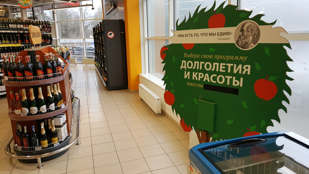 В считающемся дорогим супермаркете "Обжора": литровая бутылка водки "Хлебный дар" – 281 рубль, 400-граммовая "кишка" местного майонеза "Провансаль" – 32 рубля, десяток яиц – 60 рублей, килограмм российского сыра – 426 рублей, маленькая бутылка земляничного йогурта "Активиа" – 52 рубля.