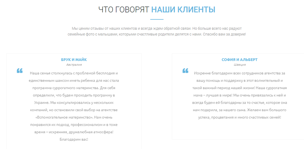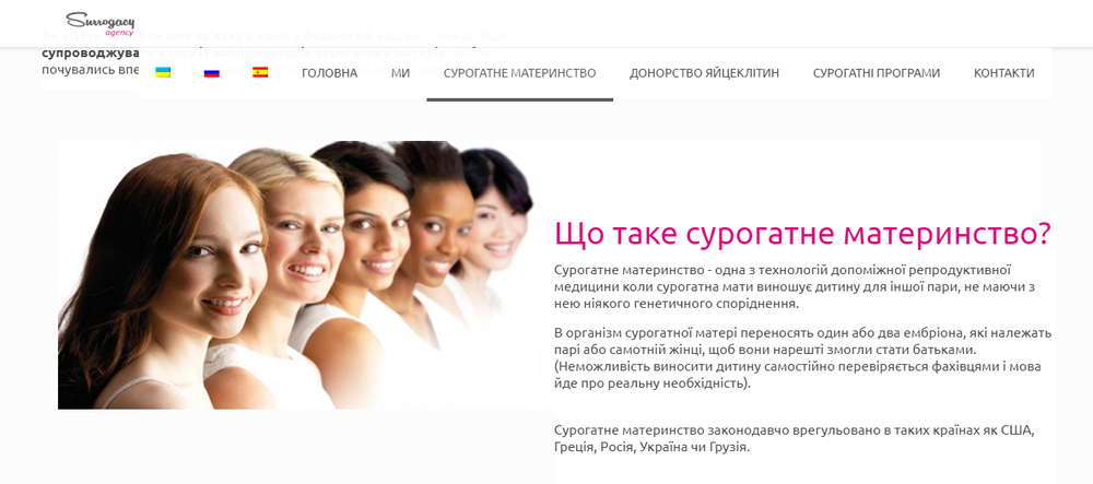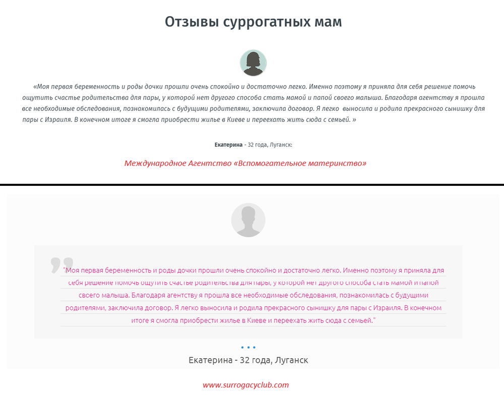 С первого взгляда видно, что сайт этого агентства сделан недавно, причем состряпан очень коряво, наспех, "на коленке". И помимо него, об этом якобы международном агентстве нет никаких упоминаний в Сети. Текст пестрит орфографическими ошибками и несогласованными фразами – так  бывает, если бездумно и не перечитывая прогонять его через онлайн-переводчик с украинского на русский и наоборот. А отзывы якобы реальных суррогатных мам, которые воспользовались услугами этой фирмы, оказываются наглым плагиатом: они абсолютно идентичны отзывам на сайте известного международного агентства "Вспомогательное материнство" (клиника "Надія"). Даже имена и возраст сурмам – те же.