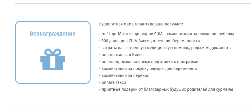– Сумма фиксированная, из нее ничего не вычитается, и она выплачивается по факту уже после рождения ребенка, – уточняет Наталья. – Отдельно оплачивается период подготовки к переносу эмбриона и сам перенос – 250 долларов. Если беременность наступает, ежемесячно еще выплачивается 300 долларов – на питание. И разово после 16-й недели беременности выплачивают 5 тысяч гривен – на одежду.