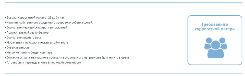 В отличие от агентства "из метро", на сайте "Вспомогательного материнства" четко перечислены все требования к суррогатным матерям. Скриншот: Страна