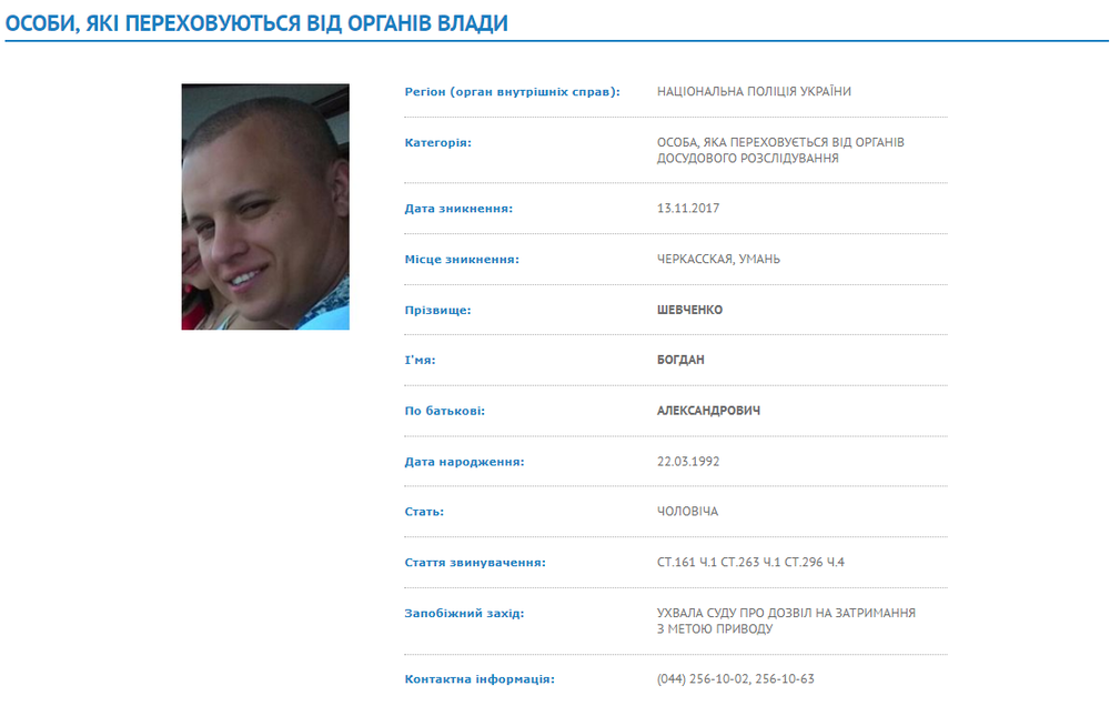 Аналогичным образом с осени прошлого года в базе розыска состоит и третий вероятный подельник провокаторов-ксенофобов. Это еще один житель Черкасчины Богдан Шевченко.