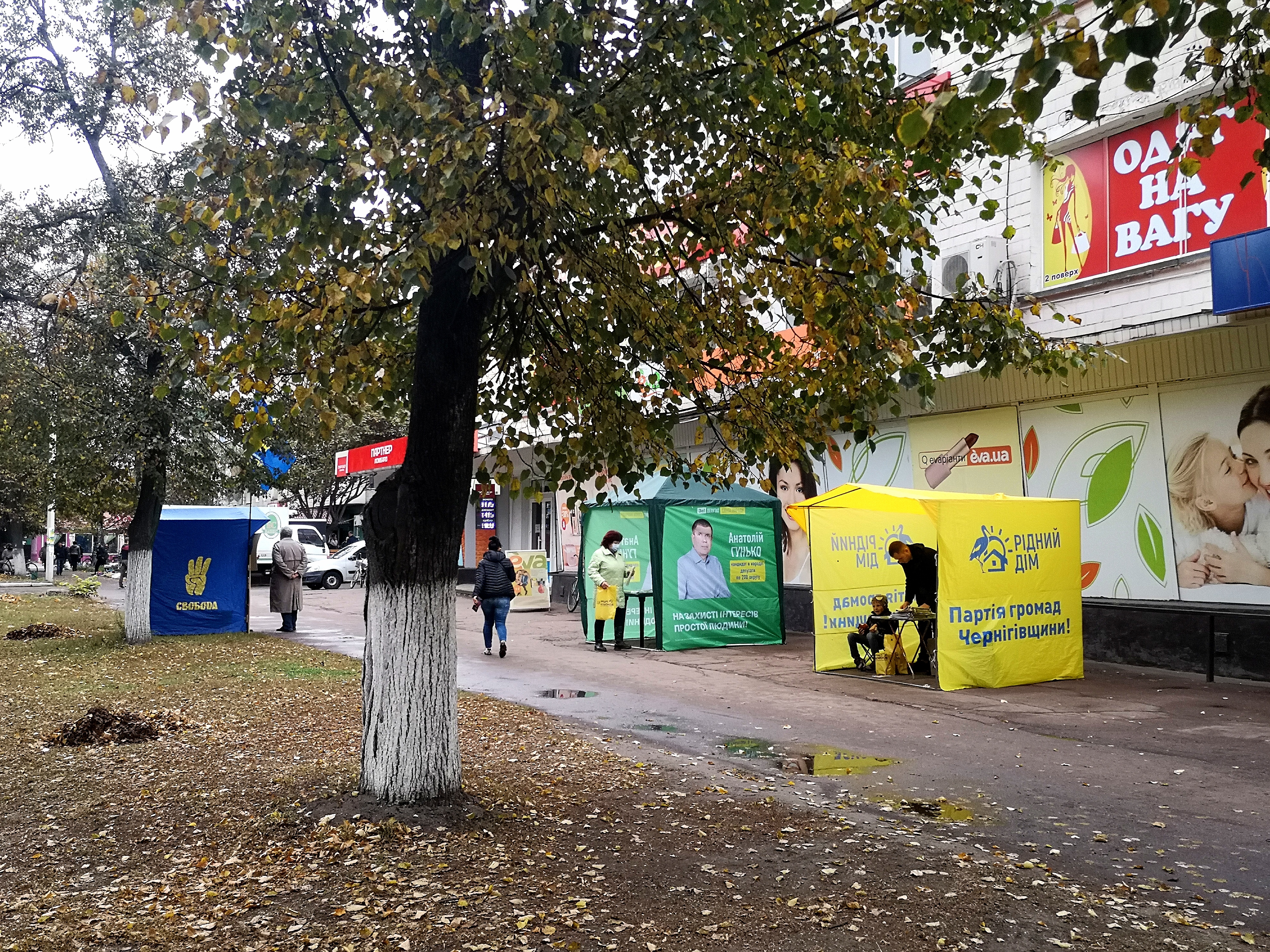 Агитаторы от разных политсил расставили брендированные палатки в главных “тусовочных местах” Бахмача - возле супермаркета и секонд-хенда. Здесь агитаторы раздают газеты от “Батькивщины”, местной партии “Рідний дім”, “Свободы”. Есть тут и палатка кандидата от “Слуги народа” Анатолия Гунько. Возле рынка - два баннера Людмилы Давиденко. А штабы основные игроки разместили в здании “Приватбанка”.