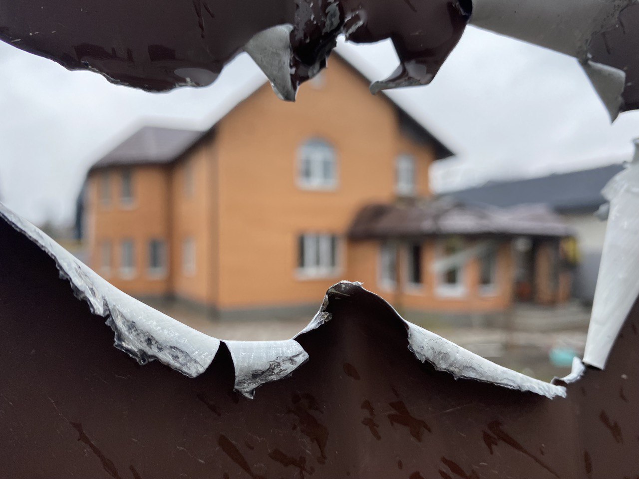 Фасад дома изуродован черной тенью от пожара. Под домом припаркована красная машина — еще одна раненая свидетельница боевых действий, судя по дыркам от пуль, заклеенных серебристым скотчем. Через дырки от снарядов в металлическом заборе просматриваются соседние частные дома с вмятинами на крышах.
