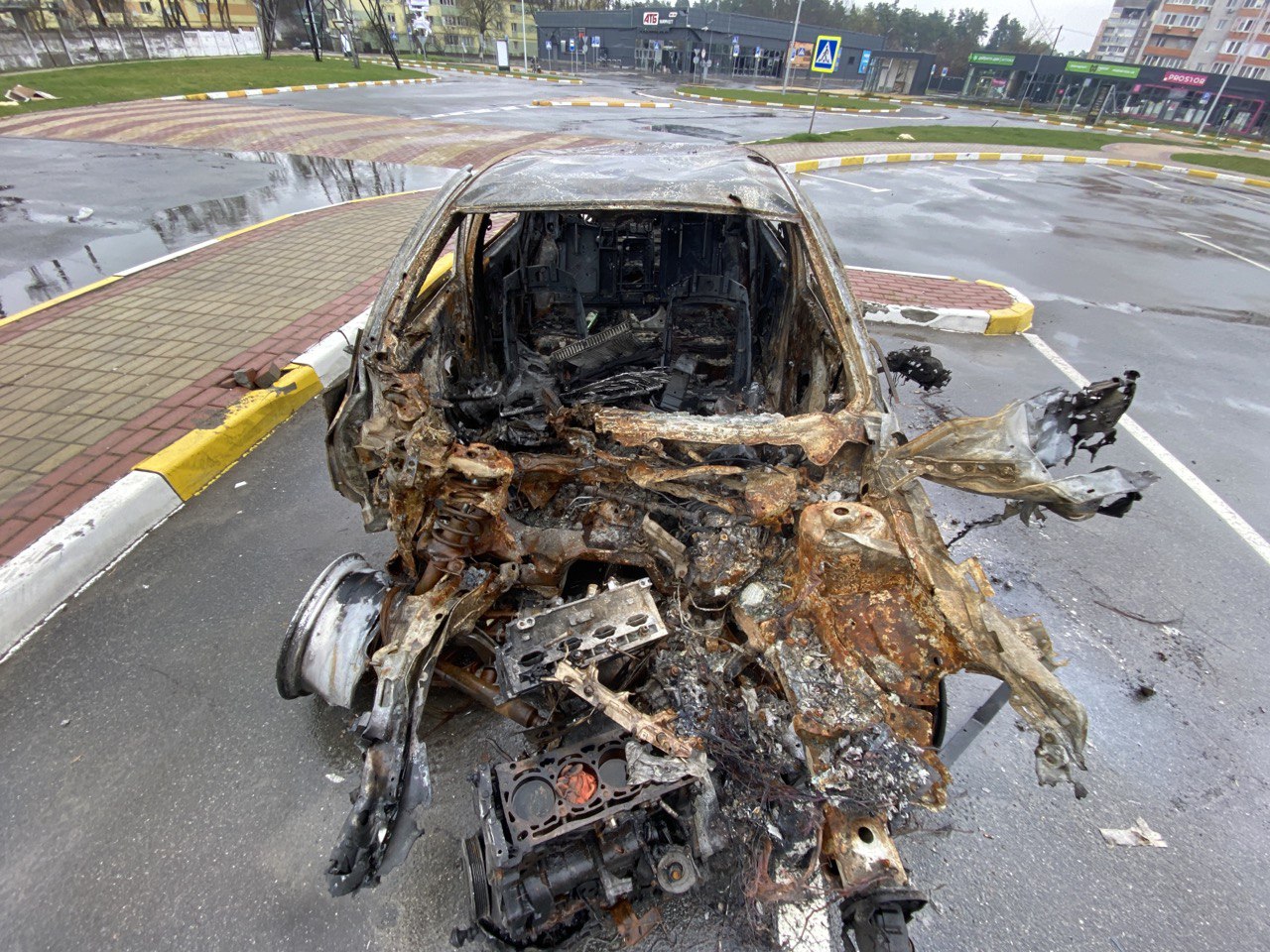 Здесь авто, ставшие свидетелями военных преступлений, ждут экспертизы и ищут своих владельцев. Вот выгоревший дотла автобус — порыжевшие от огня перегородки между окошками выглядят, как тюремная клетка. Вот расстрелянный автомобиль охранной фирмы. Вот — продырявленная пулями легковушка. На лобовом стекле прикреплена крупная надпись: “Дети”.