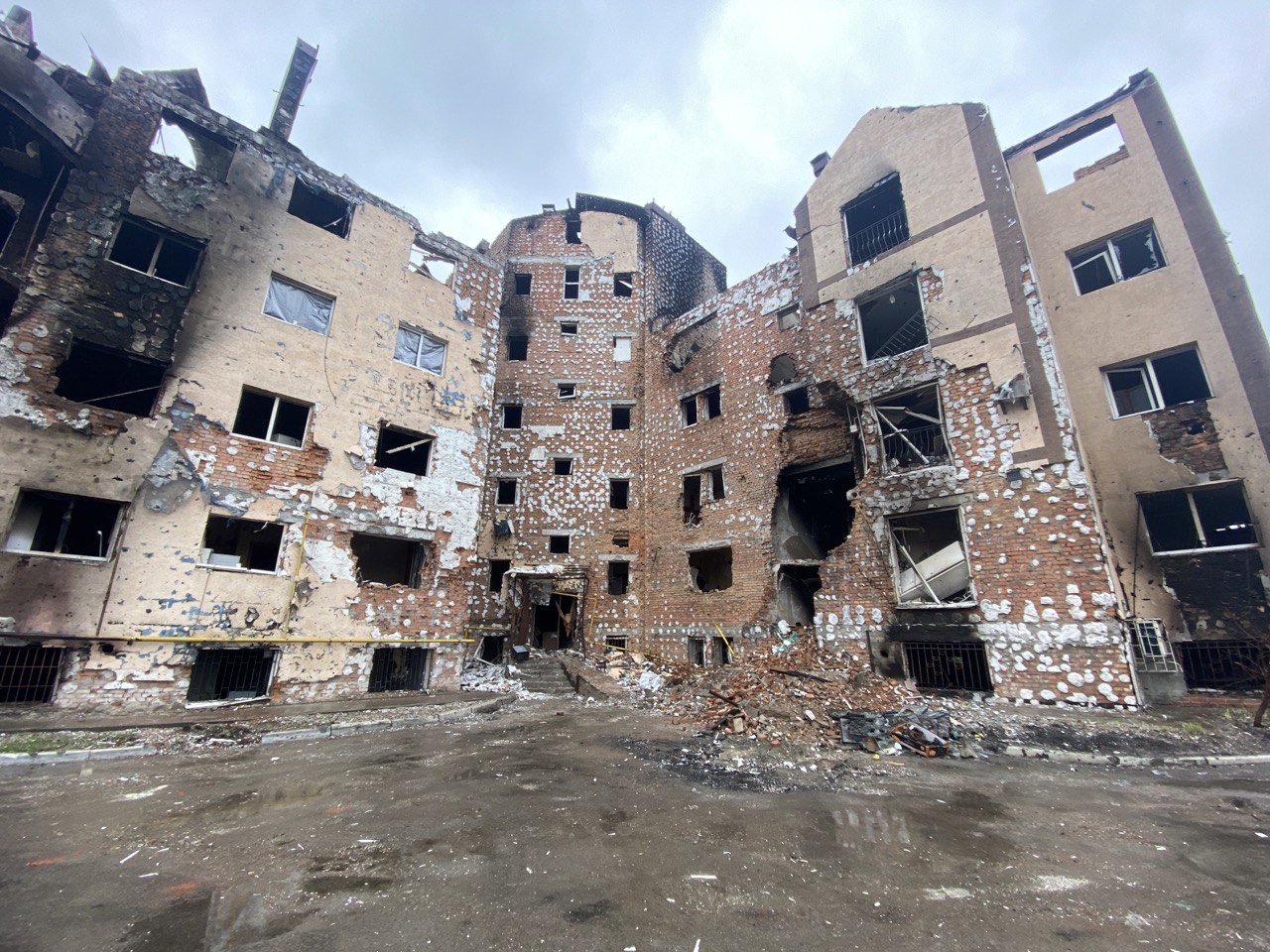 ЖК "Континент" в Буче — один из наиболее пострадавших от обстрелов российских войск в Ирпене. Нет ни одного целого окна, здания в следах от пожаров. Фото: "Страна"