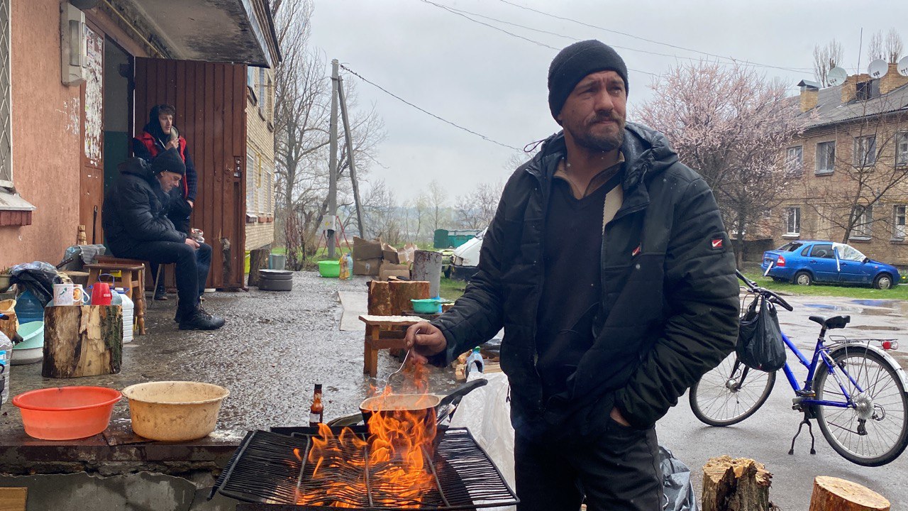 Возле длинного двухэтажного дома, похожего на общежитие, несколько мужчин разожгли мангал. Электричества, газа и света в их районе все еще нет, поэтому готовить еду приходится на улице.
