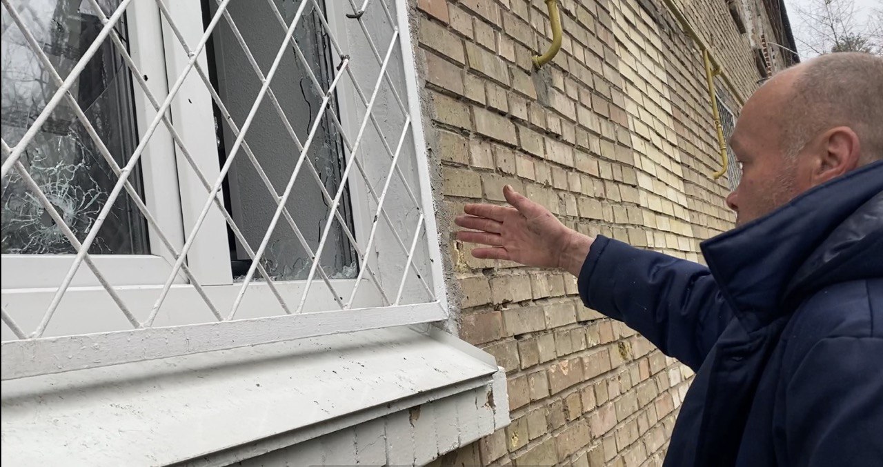 Его сосед, Николай, рассказывает, что прямо в его квартиру попал снаряд — прилетел в коридор. Мужчина показывает нам разбитое стекло, через которое видно перекошенную мебель. Николая спасла его пагубная привычка: в это время он как раз вышел покурить на улицу.