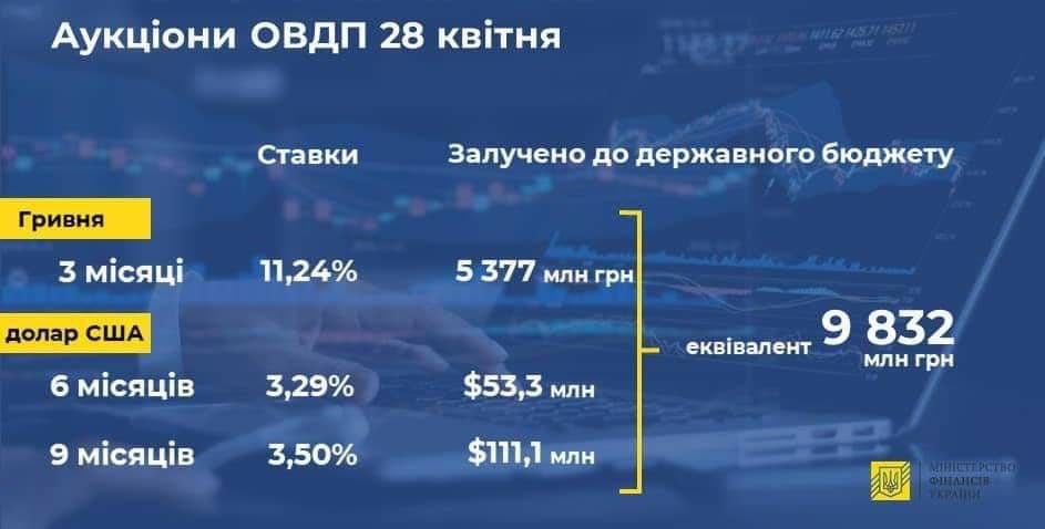 2. Каким будет результат первого удачного размещения Минфином его ОВГЗ. До этого чиновники отменили четыре аукциона подряд из-за низкого спроса на бумаги. Сегодня состоялось первое в апреле размещение бумаг.