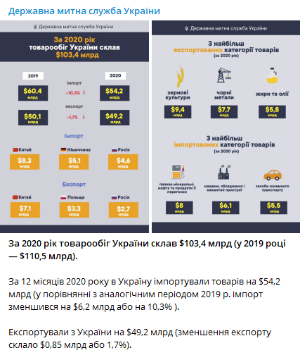 Ранее "Страна" уже писала, что в 2020 году украинский экспорт не упал так сильно как импорт благодаря резкому увеличению поставок продукции (зерна и руды) в Китай, который по итогом года стал крупнейшим торговым партнером Украины.