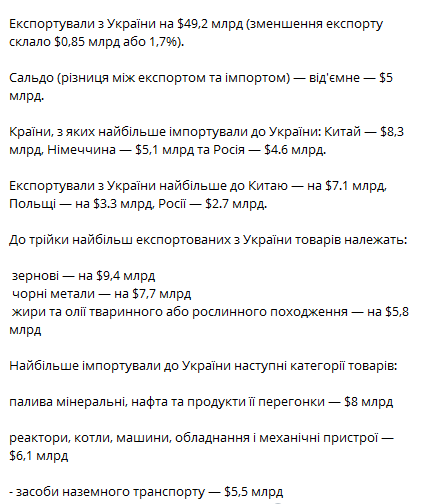 Экспортировали из Украины в прошлом году на $49,2 млрд (уменьшение экспорта составило $0,85 млрд или 1,7%).