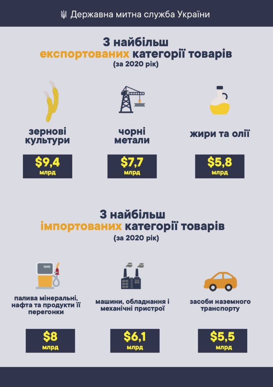 В тройку наиболее экспортируемых из Украины товаров попали: зерновые - на $9,4 млрд, черные металлы - на $7,7 млрд, а также жиры и масла животного или растительного происхождения - на $5,8 млрд (в основном подсолнечное масло).