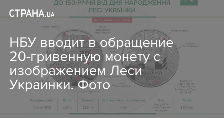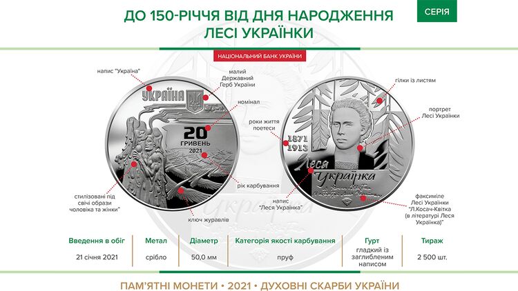 Национальный банк Украины с четверга, 21 января, вводит в обращение памятную монету с изображением Леси Украинки по случаю 150-летия со дня рождения поэтессы.