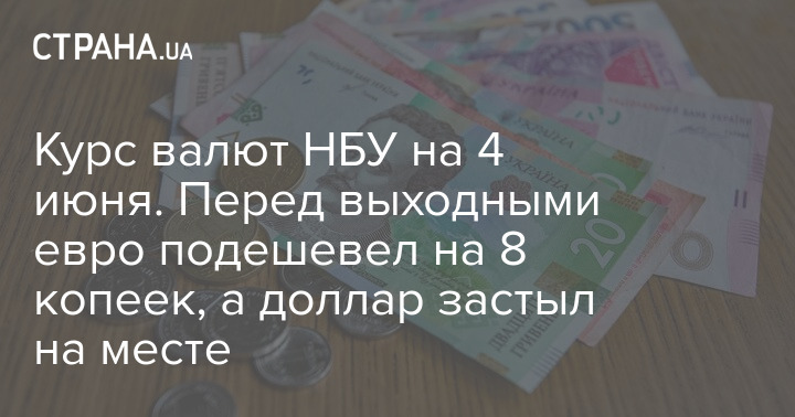 Национальный банк Украины (НБУ) в пятницу, 4 июня, установил официальный курс гривны по отношению к иностранным валютам. По сравнению с предыдущим рабочим днем доллар в цене не изменился, а евро подешевел.
