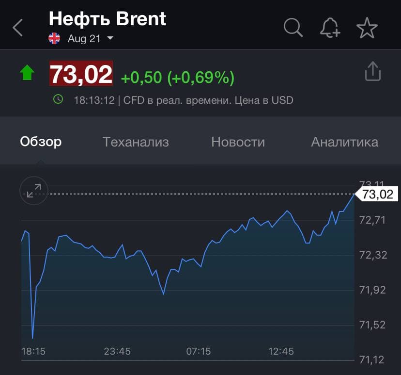 Стоимость августовского фьючерса на нефть марки Brent выросла на 0,69%, до $73,02 по состоянию на 18:13 по киевскому времени. В последний раз цена нефти превышала $73 за баррель более двух лет назад - 20 мая 2019 года.