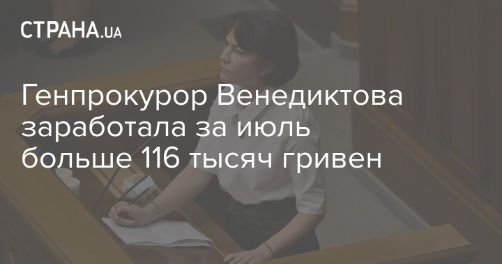 Так, по информации Офиса генпрокурора, Венедиктова за июль 2021 года получила 116 239 грн зарплаты. При этом ее оклад - 70 720 грн. Также ей были начислены надбавки за работу с документами, содержащими гостайну, и за выслугу лет.