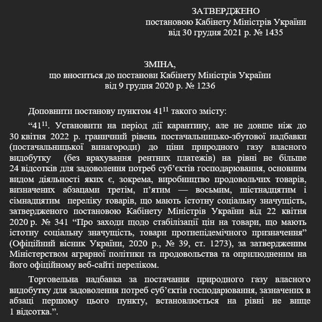Кабинет министров ограничил предельный уровень надбавки к цене природного газа собственной добычи, который используют производители социальных продуктов. Максимальная прибавка до 30 апреля составит 24%. Об этом идет речь в постановлении правительства от 30 декабря 2021 года № 1435.
