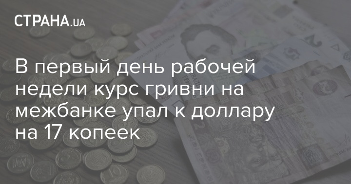 Курс гривни на межбанковском валютном рынке после снижения пятницу на 4 копейки в понедельник снизился на 17 копеек и составил 28,59 гривен за 1 доллар.