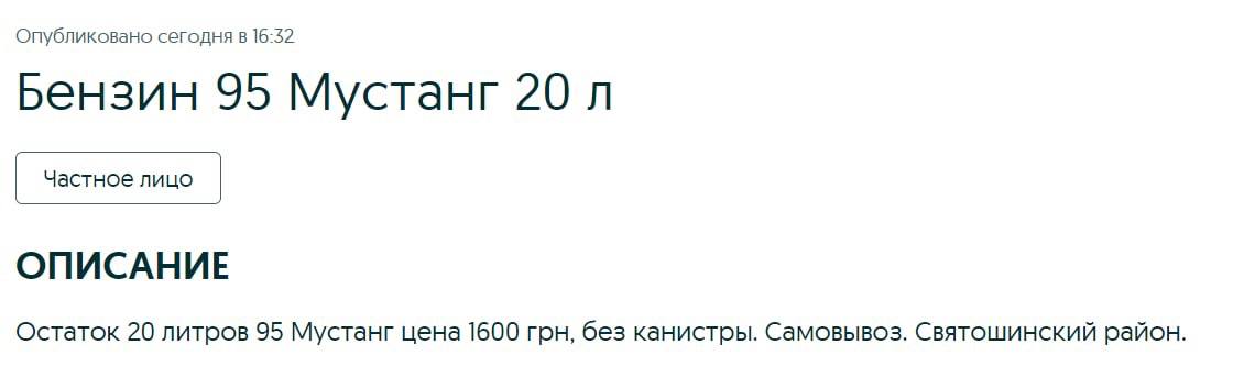 "В наличии хороший 95 бензин. Продам без очереди (позвонили, договорились, приехали, купили). Цена - 100 грн за литр", - говорит в одном из объявлений.