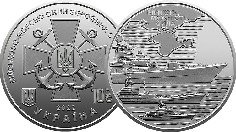 На монете изображена эмблема ВМСУ, а на обратной стороне - надпись "Верность, мужество, сила", корабли ВМС и южные рубежи Украины и морские границы страны.