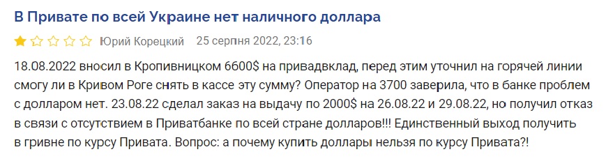 "23.08.22 сделал заказ на выдачу по $2 тыс. на 26.08.22 и 29.08.22, но получил отказ в связи с отсутствием в Приватбанке по всей стране долларов!!! Единственный выход получить в гривне по курсу Привата. Вопрос: а почему купить доллары нельзя по курсу Привата?!" - говорится в информации Юрия.
