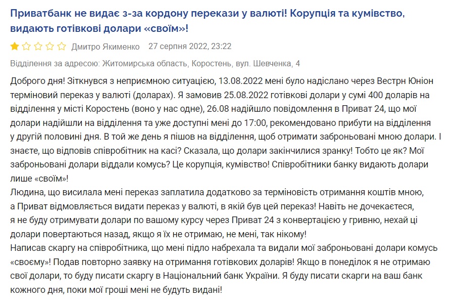 Дмитрий Якименко из города Коростень рассказал, что предварительно заказал получение долларового денежного перевода в размере $400 на конкретное отделение Приватбанка (ул. Шевченко, 4), там даже подтвердили наличие валюты и пригласили человека на получение на конкретное время. А когда он явился, то ему цинично заявили, что наличный доллар уже закончился. Из-за чего у Дмитрия родились естественные опасения на предмет выдачи валюты «своим» по блату.