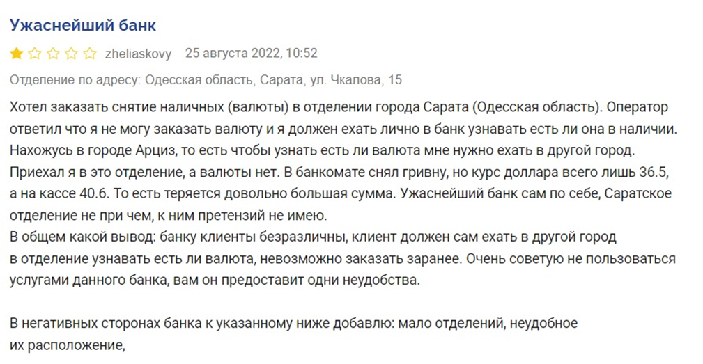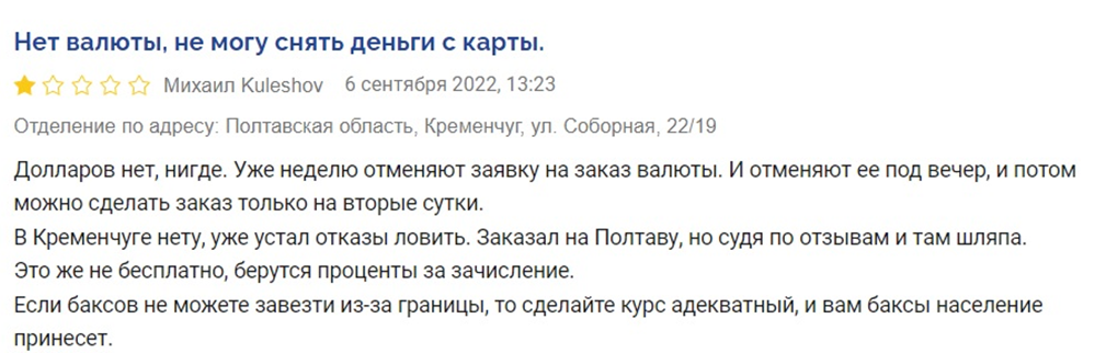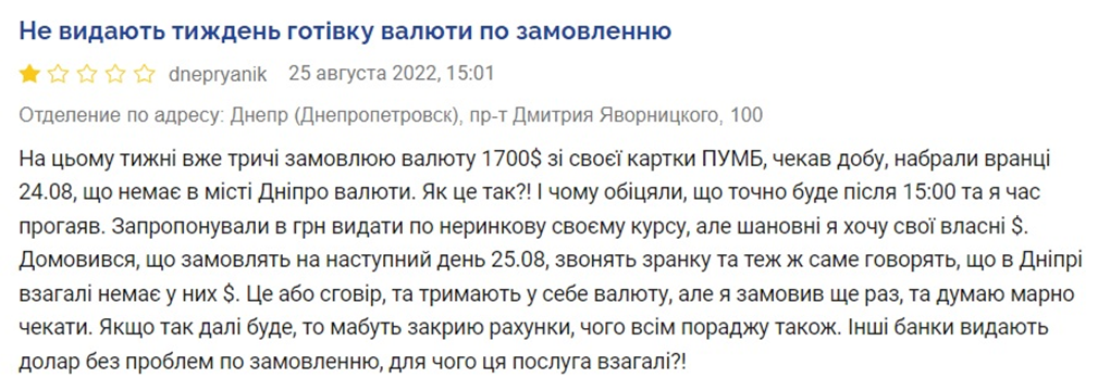 "Договорился, что закажут на следующий день 25.08, звонят утром и тоже говорят, что в Днепре вообще нет у них $. Это или сговор, и держат в себе валюту, но я приказал еще раз, и думаю бесполезно ждать. Если так дальше будет, то, пожалуй, закрою счета, чего всем посоветую тоже. Другие банки выдают доллар без проблем по заказу, для чего эта услуга вообще?" — заметил пострадавший.