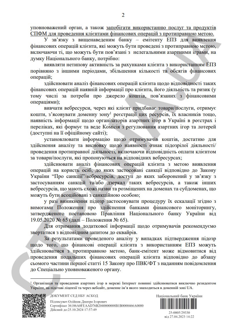 При этом НБУ потребовал от банков уделить особое внимание проверке интернет-платежей украинцев за азартные игры. Цель - выявлять оплату незаконной игры, то есть игорного бизнеса, который не получил соответствующую лицензию у регулятора - у Комиссии по регулированию азартных игр и лотерей (КРАИЛ), и не платит соответствующие налоги (а это большое число онлайн-казино, которыми пользуются украинцы).