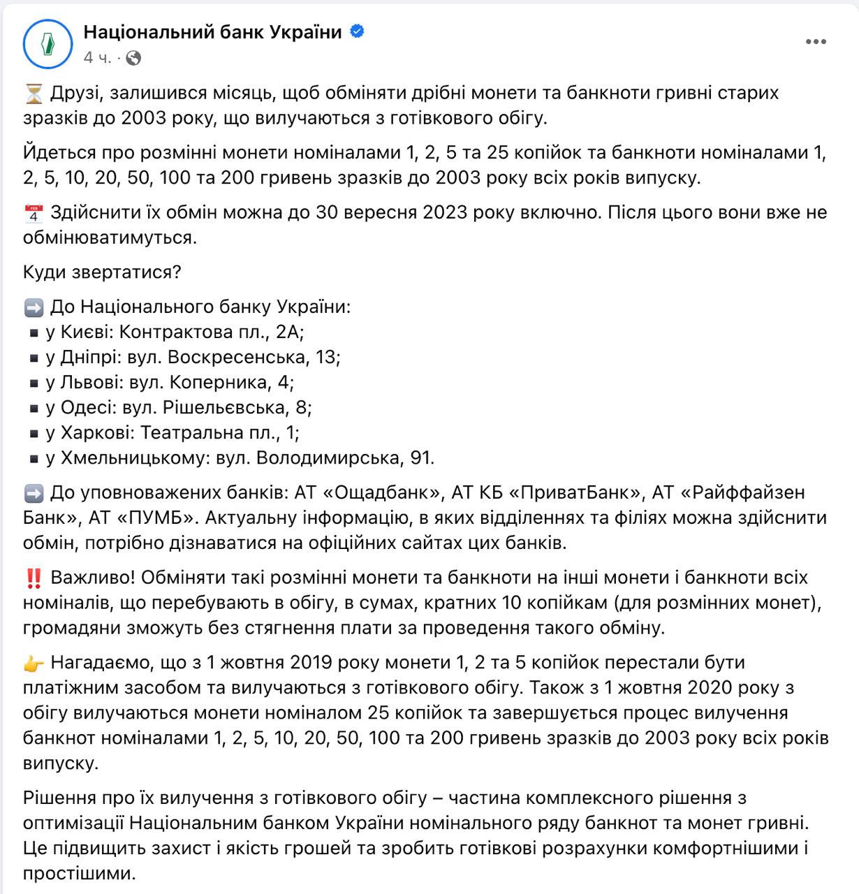 Речь идёт о разменных монетах номиналами 1, 2, 5 и 25 копеек и банкнотах номиналами 1, 2, 5, 10, 20, 50, 100 и 200 гривен образцов до 2003 года всех лет выпуска.