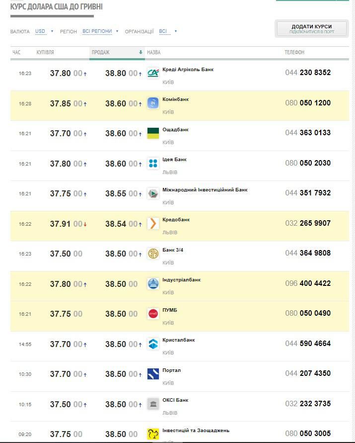 • 37,70-38,60 грн/$ — Ощадбанк;