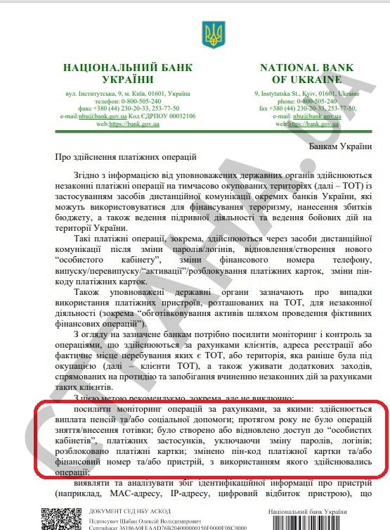 В нем говорится о том, что регулятор получил от государственных органов информацию о незаконных платежных операциях, проходящих "на временно оккупированных территориях (далее - ВОТ) с использованием удвоенных систем коммуникаций украинских банков".