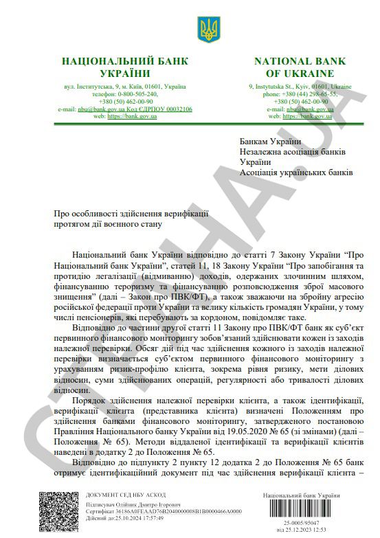 Украинским пенсионерам пытаются упростить открытие и пользование пенсионными счетами в банках. Для этого Нацбанк разослал по финучреждениям внутренне письмо №25-0005/95047, оказавшееся в распоряжении "Страны", под заголовком "Об особенностях осуществления верификации на протяжении военного положения".
