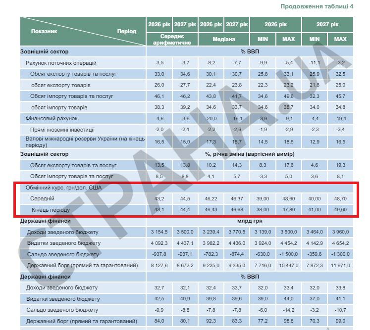 • 2027 год: 48,70 грн/$ — средний, 49,60 грн/$ — на конец года.