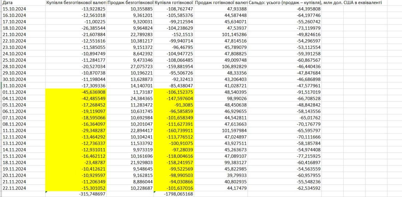 Несмотря на это финансисты отмечают стабильный валютный спрос со стороны населения. По данным Нацбанка, с 1 по 22 ноября физлица купили наличными $1,8 млрд, а в безналичной форме — $315,7 млн.