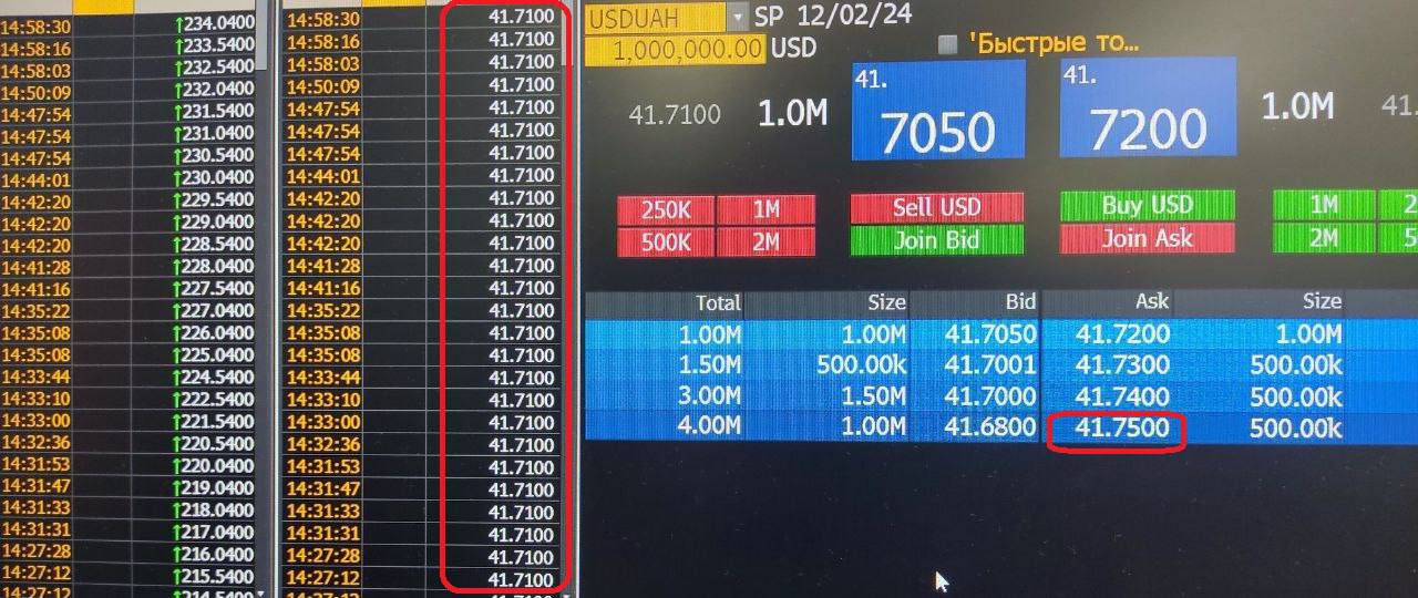 Межбанковский же рынок в понедельник уходил намного выше: открытие торгов на площадке Bloomberg прошло с 41,58 грн/$, за час с небольшим котировки поднялись до 41,67 грн/$ и в обед достигли 41,7051 грн/$, после чего почти все сделки состоялись по 41,71 грн/$. Предложения валютных спекулянтов достигали 41,75 грн/$. Сделок на этом уровне не было, но он стал индикатором.