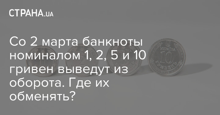 Нацбанк заявил о выводе со 2 марта из денежного оборота Украины четырех мелких банкнот номиналом 1,2,5 и 10 гривен. С этой даты они перестанут быть средствами платежа и будут изъяты из денежного оборота, то есть их перестанут принимать в магазинах и на рынках, а также банковские учреждения и небанковские платежные организации для пополнения счета и переводов.
