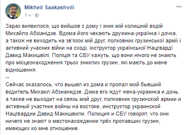 "Сейчас оказалось, что вышел из дома и пропал мой бывший водитель Михаил Абзианидзе. Дома его ждут жена-украинка и дочь, а также не выходит на связь мой друг, полковник грузинской армии и активный участник войны на востоке, инструктор украинской Нацгвардии Давид Макишвили", - написал Саакашвили.
