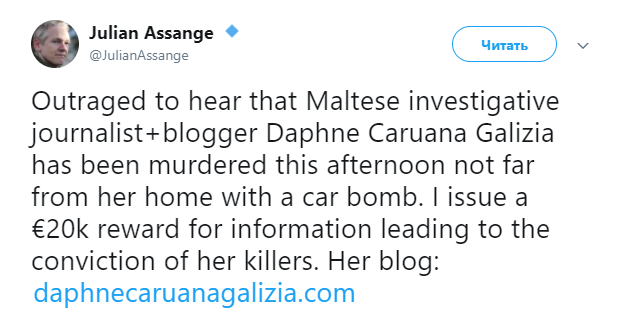После инцидента основатель сайта Wikileaks Джулиан Ассанж также предложил награду за информацию об убийцах Гализии. "Я с негодованием узнал, что мальтийская журналистка-расследователь и блоггер Дафни Каруана Галиция была убита сегодня днем недалеко от своего дома автомобильной бомбой. Я объявляю награду в €20 тыс. за информацию, которая приведет к признанию виновными ее убийц", - написал он в Twitter.