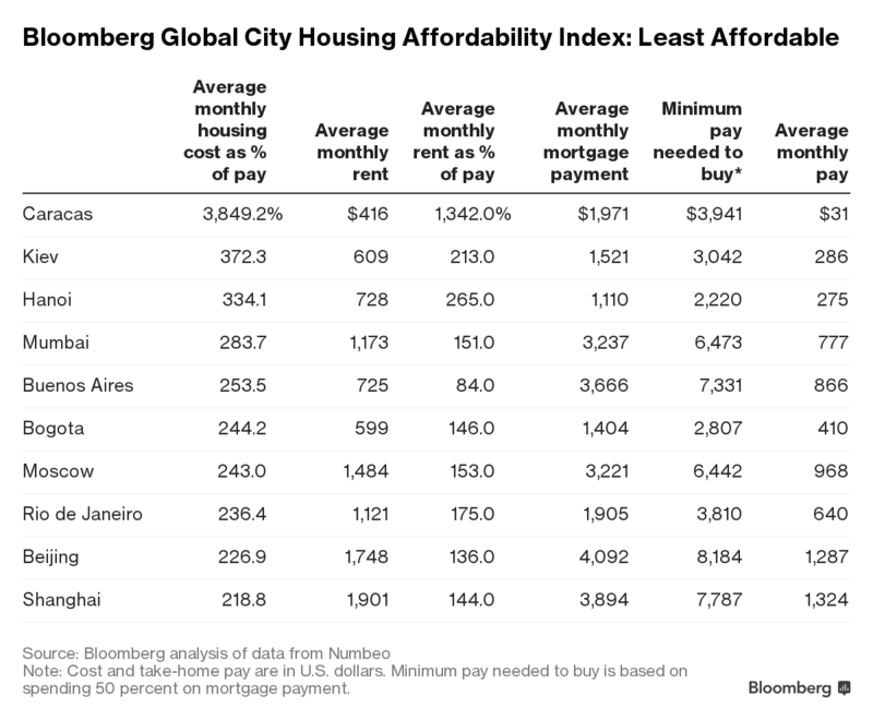 Согласно рейтингу Bloomberg, аренда жилья в Киеве обходится в среднем в $609, что составляет две месячные зарплаты (286 долл.). В этом компоненте украинскую столицу опережает только Каракас, где аренда жилья обходится в 14 месячных зарплат.