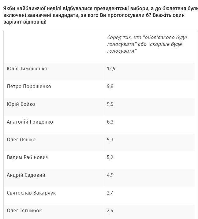 Показатель поддержки Порошенко значимо уменьшился: с 12,8% в сентябре до 9,9% в октябре (среди респондентов, которые будут участвовать в выборах).