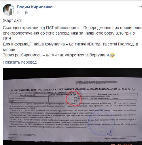 "Шутка дня: сегодня получили от ПАО "Киевэнерго" - предупреждение о прекращении электроснабжения объектов заповедника по наличию долга 0,18 грн. с НДС. Для информации: наша коммуналка - это тысячи кВт/ч и сотни Гкал/ч в месяц. Сейчас разбираемся - где мы так "жестко" задолжали", - написал он.