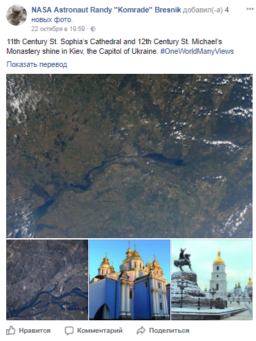 Астронавт NASA Рэндольф Брезник, который сейчас находится на борту Международной космической станции, опубликовал вид Киева из космоса. Фотоснимками американский астронавт поделился на своей странице в Facebook.