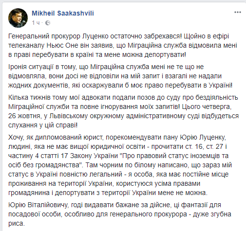 "Он заявил, что Миграционная служба отказала мне в праве находиться в стране и меня можно депортировать! Ирония в том, что Миграционная служба мне не то что не отказывала, они до сих пор не ответили на мой запрос и вообще не предоставили никаких документов, которые оспаривали бы мое право находиться в Украине! Хочу, как дипломированный юрист, порекомендовать господину Юрию Луценко, человеку, который не имеет высшего юридического образования - прочитать господину Луценко прочитать ст. 16, ст. 27 и часть 4 статьи 17 Закона Украины "О правовом статусе иностранцев и лиц без гражданства". Там черным по белому написано, что сейчас мой статус в Украине полностью легальный", - заявил Саакашвили.
