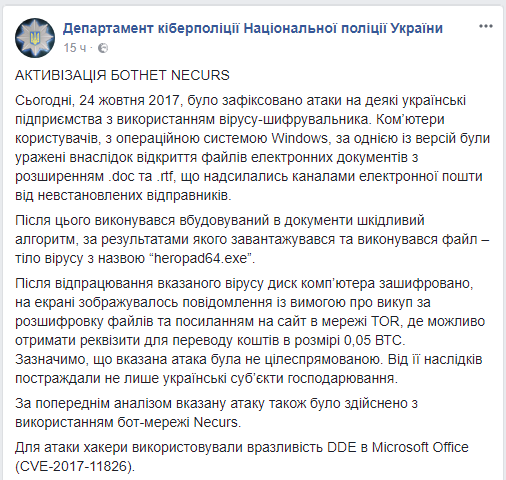 Атака не была целеустремленной, от нее пострадали не только украинские предприятия. Согласно предварительному анализу, указанную атаку также было осуществлено с использованием бот-сети Necurs. Тогда для этого использовали уязвимость DDE в Microsoft Office (CVE-2017-11826).
