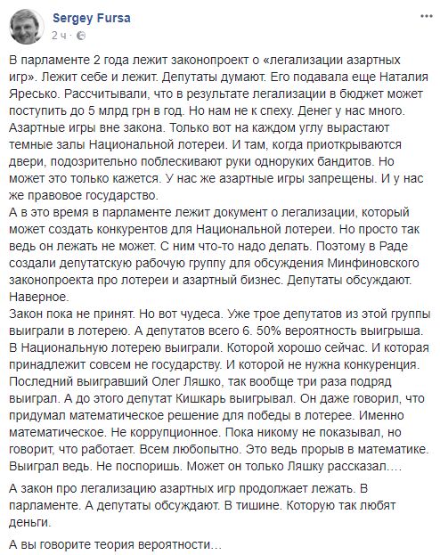 Сергей Фурса, финансовый аналитик, рассуждает о легализации игорного бизнеса: "В парламенте 2 года лежит законопроект о легализации азартных игр. Лежит себе и лежит. Депутаты думают. Его подавала еще Наталия Яресько. Рассчитывали, что в результате легализации в бюджет может поступить до 5 млрд грн в год. Но нам не к спеху. Денег у нас много.