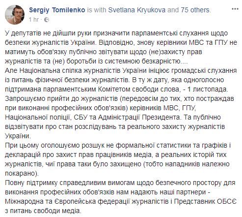 "Национальный союз журналистов Украины инициирует общественные слушания по вопросам физической безопасности журналистов. В ту же дату, которая единогласно поддержана парламентским Комитетом свободы слова, - 1 ноября", - пишет Томиленко.