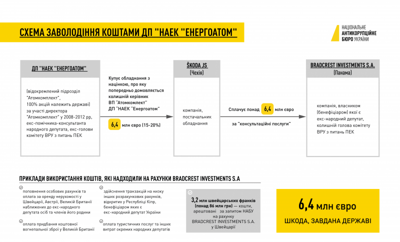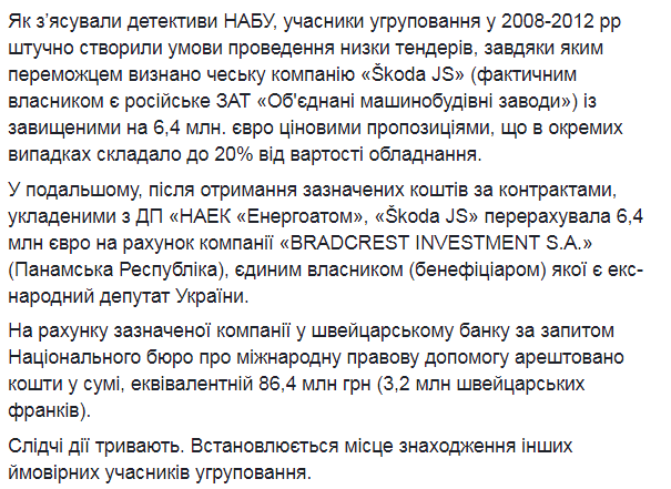 В дальнейшем, после получения указанных средств по контрактам, заключенным с ГП "НАЭК" Энергоатом", "Škoda JS" перечислила 6 400 000 евро на счет панамской компании "BRADCREST INVESTMENT SA", единственным владельцем (бенефициаром) которой является данный экс-нардеп.