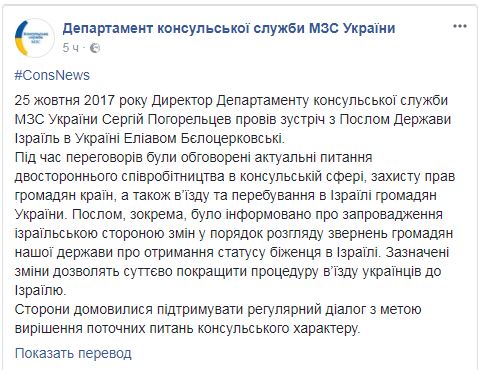 "Отмеченные изменения позволят существенно улучшить процедуру въезда украинцев в Израиль", - сообщается на странице Департамента консульской службы в соцсети Facebook.