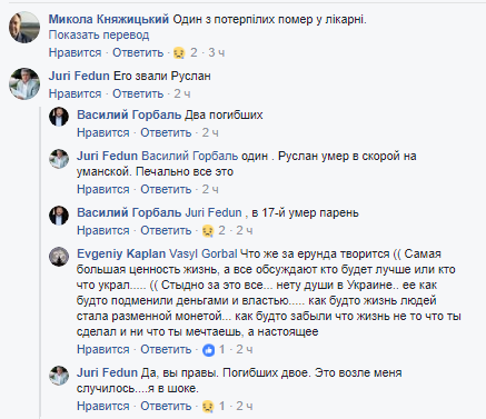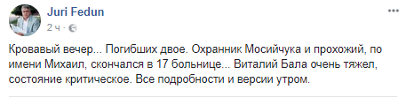 Помощник нардепа Олега Ляшко на общественных началах Юрий Федун уточнил, что погибших двое: охранник Мосийчука, который умер в машине скорой помощи и прохожий, по имени Михаил, который скончался в 17-й больнице.