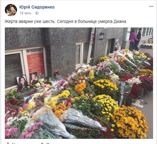 "Жертв аварии уже 6. Сегодня в больнице умерла Диана", — написал Сидоренко.